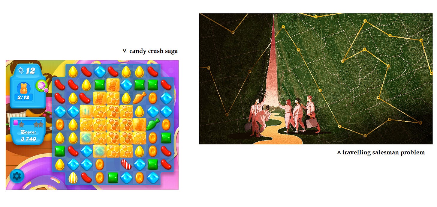 NP complete problems include the infamous ‘Travelling Salesman Problem’, ‘nxn sudoku’, and even ‘Candy Crush’!