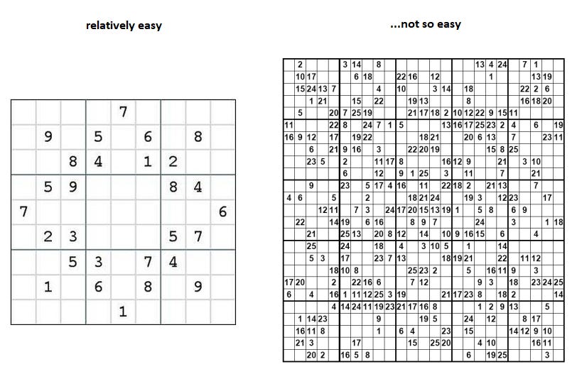 A 9x9 sudoku grid is not NP-complete, however, the general concept of an nxn sudoku grid is. Above are two puzzles, one possibly slightly more difficult than the other. However, checking the answer to either would undoubtedly be easier than solving the problems themselves. But what if it were as easy to solve as it is to check? - in other words, does P = NP?