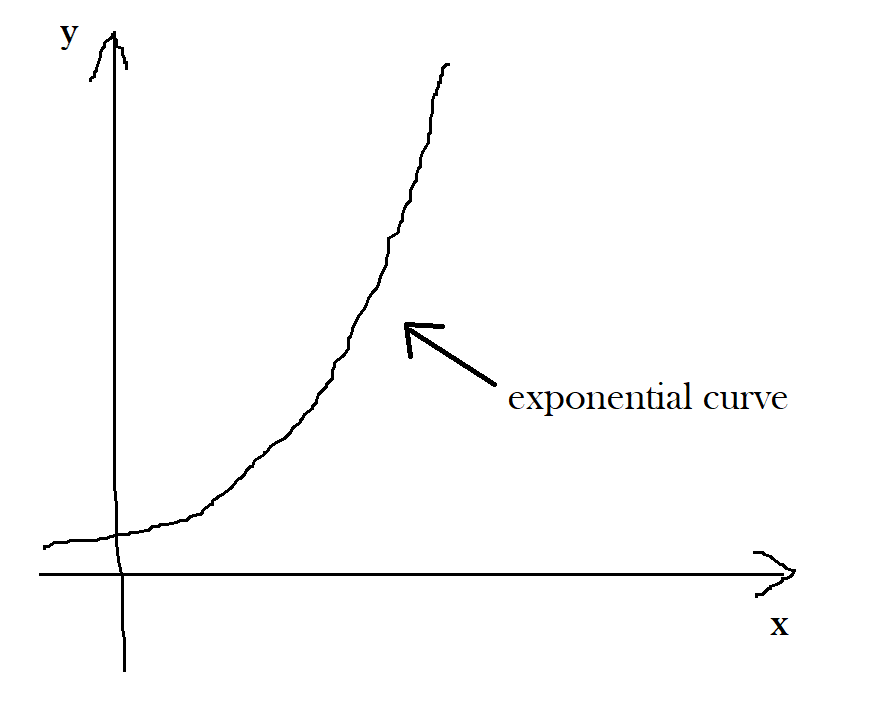 exponential - This means that as the input value x increases, y increases at a much faster rate shooting off to infinity.